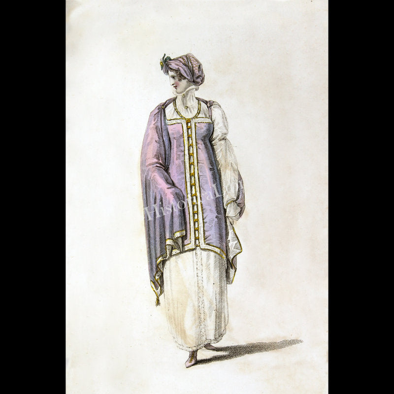 - Lady standing. Wearing a light white and purple dress with shawl and yellow edging and purple hat