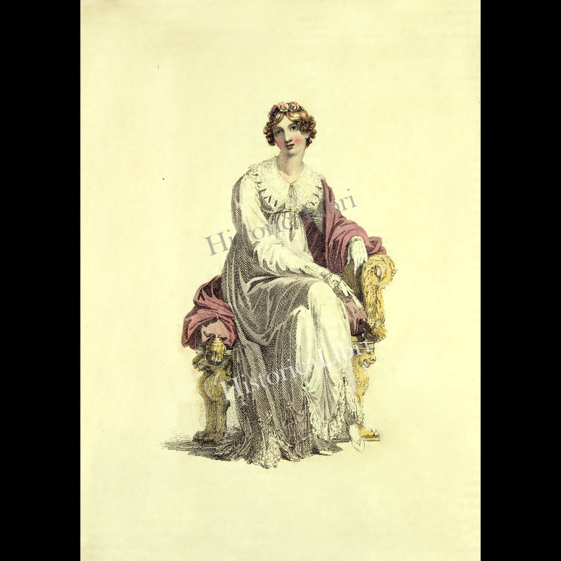 - Fashionable lady sitting in a very ornate chair, wearing formal dress in white.