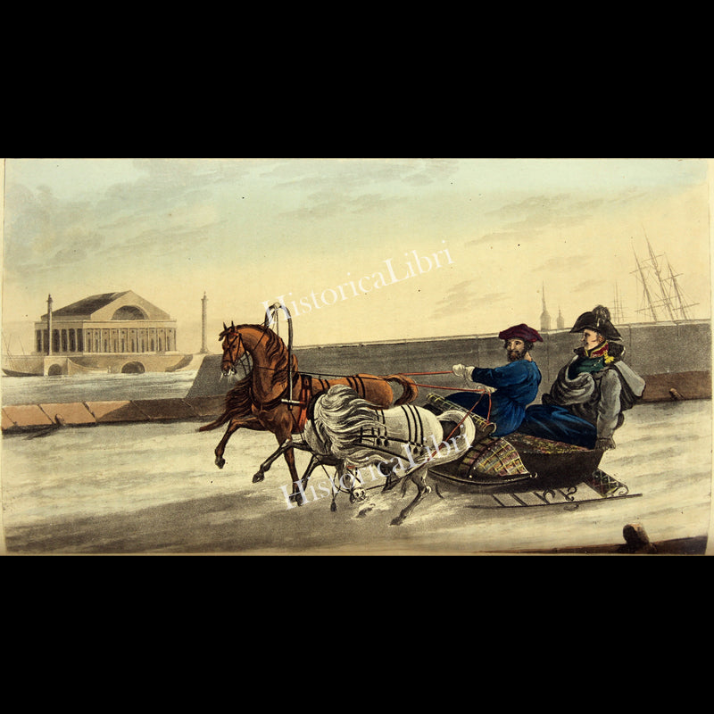 - Fast sleigh with 2 men inside, pulled by couple of horses. A river shore and a large building are seeing across the river.